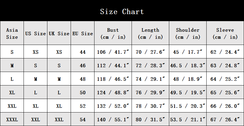 • Asian sizing: we recommend choosing one size up for US/EU customers